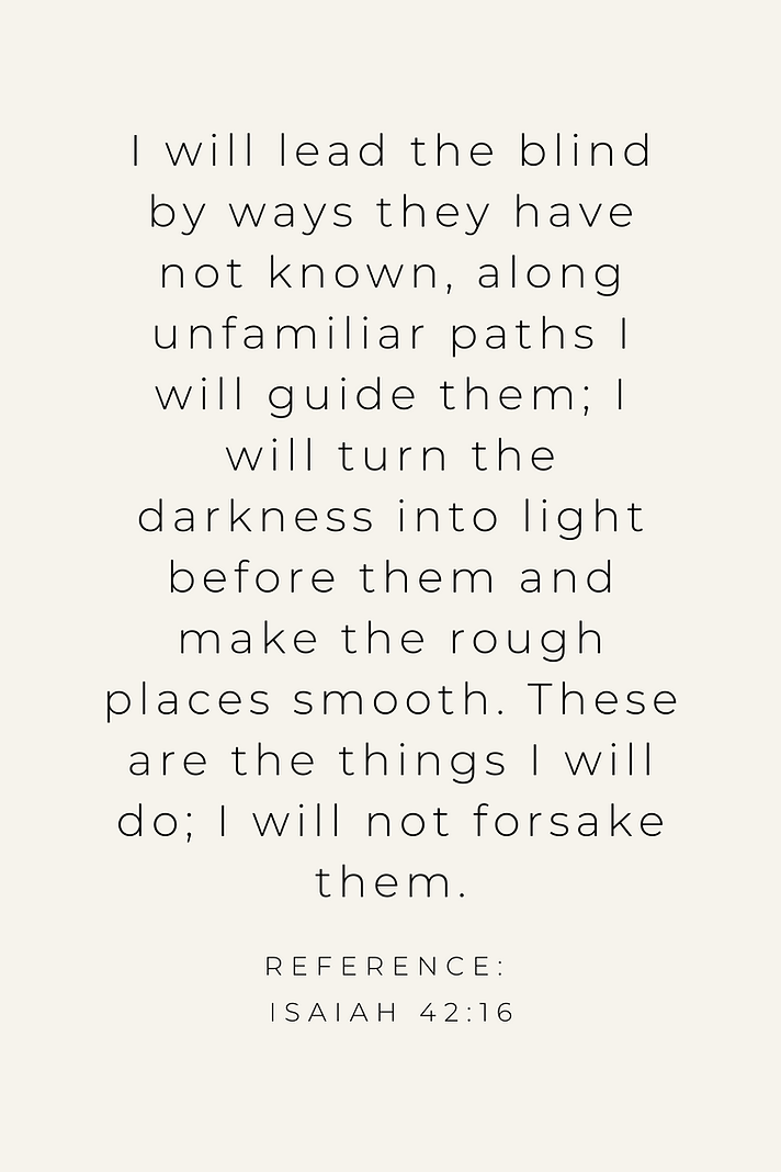 I will lead the blind by ways they have not known, along unfamiliar paths I will guide them; I will turn the darkness into light before them and make the rough places smooth. These are the things I will do; I will not forsake them. Isaiah 42:16NIV